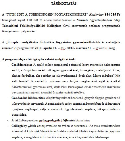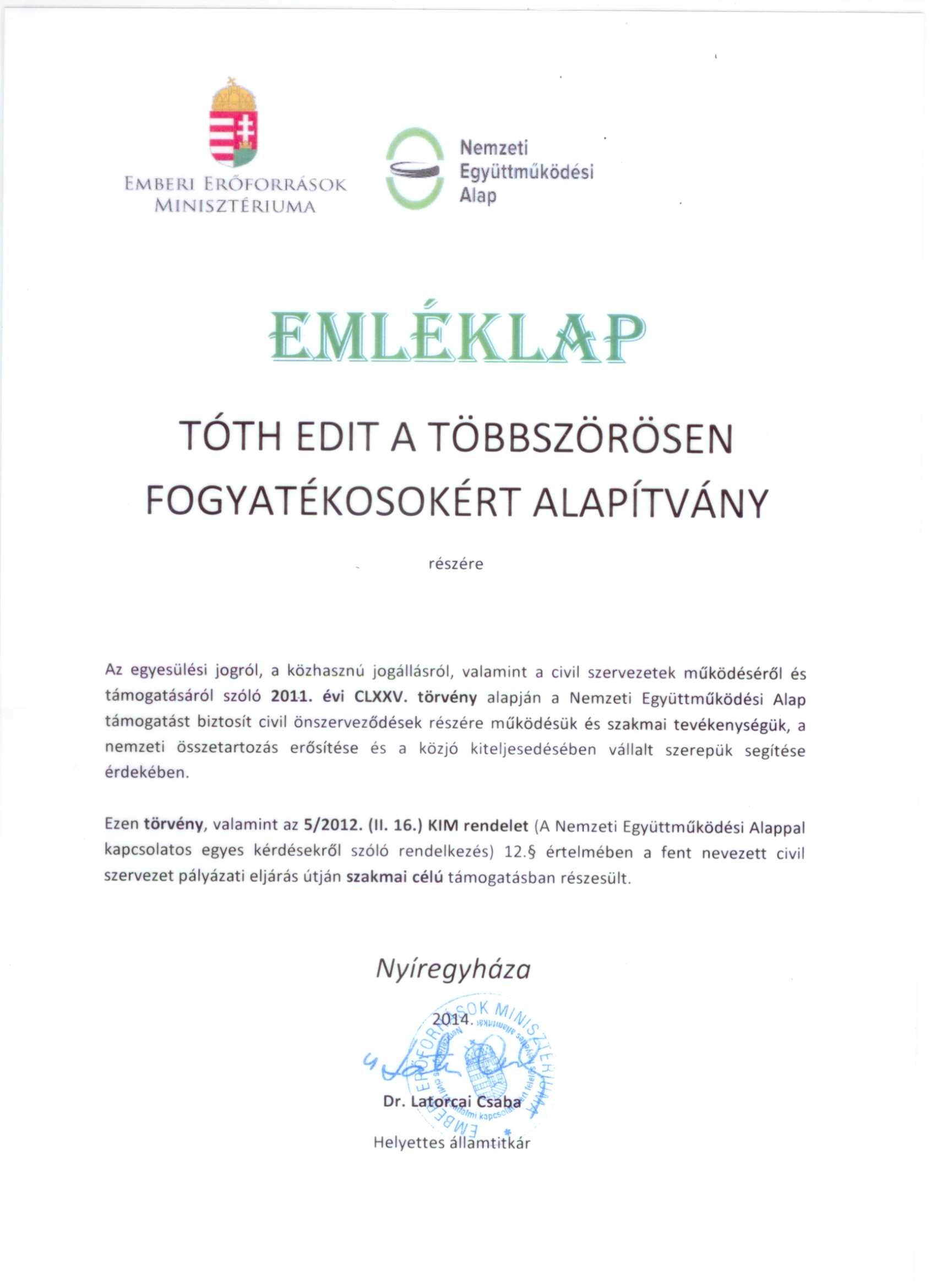Az Emberi Erőforrás Minisztérium és a Nemzeti Együttműködési Alap Társadalmi Felelősségvállalás Kollégiuma által alapítványunk pályázatot nyert szakmai programjának megvalósítására 554255.- Ft összegben. A Projekt neve "Komplex szolgáltatás biztosítása fogyatékos gyermekek/fiatalok és családjaik részére. A nyertes pályázók emléklapot vehettek át Dr. Latorcai Csaba Helyettes államtitkártól, és Dr. Kovács Ferenc Nyíregyháza Megyei Jogú Város Polgármesterétől. Köszönjük, hogy programunkat érdemesnek találták támogatásukra.